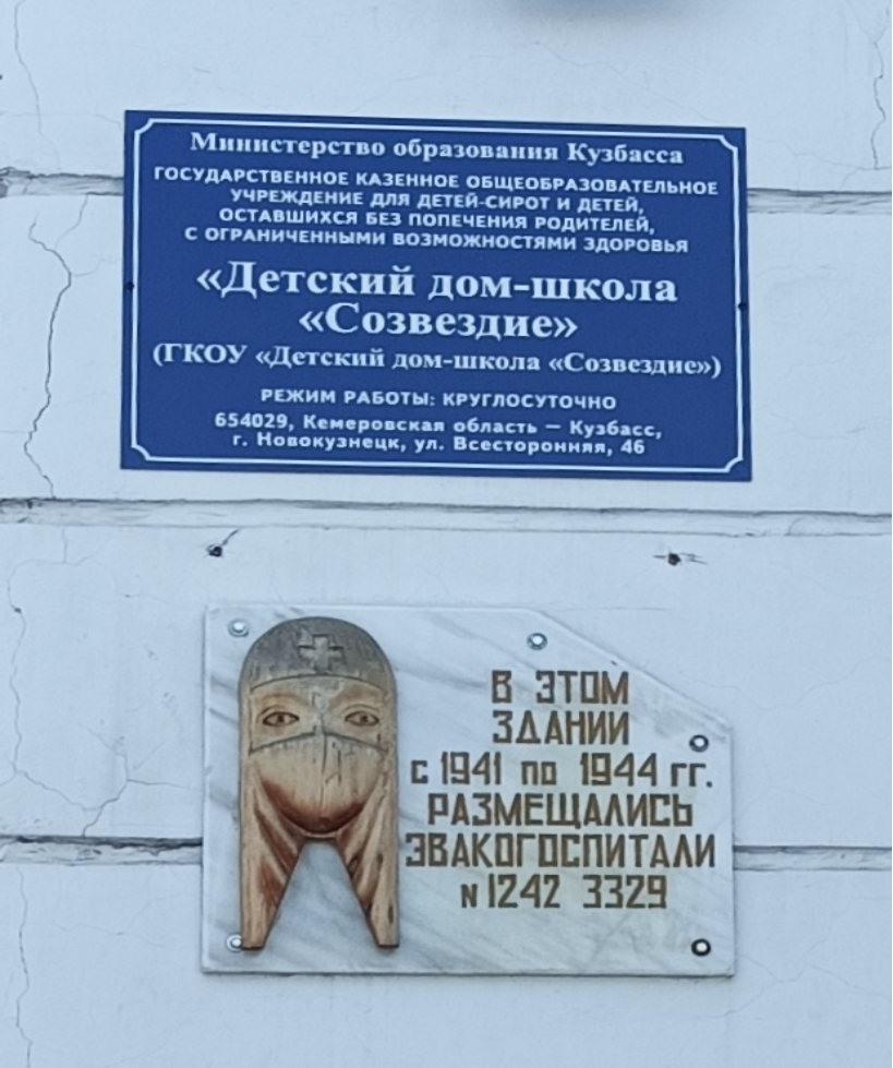 5. Мемориальные доски об эвакогоспиталях // Мемориальные, информационные доски и памятники Великой Отечественной войны : справочник / составители: И. В. Ульянова, Е. В. Камык, Е. А. Лихачева, А. А. Ищенко ; ответственный редактор М. М. Маслов ; редактор И. В. Ульянова ; фотографии: К. В. Новицкас, Е. В. Камык. – Новокузнецк, 2010. – С. 13 : фот.
