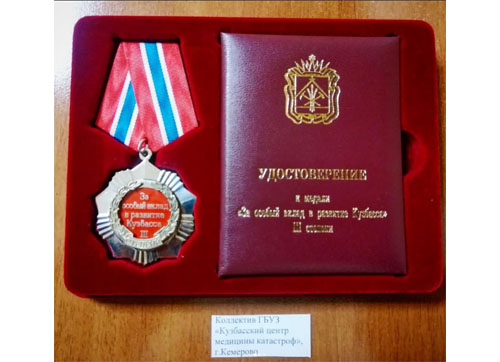 В 2021 году ГБУЗ «Кузбасский центр медицины катастроф» награжден медалью «За особый вклад в развитие Кузбасса» III степени за многолетний плодотворный труд, достижение значимых результатов в государственной, экономической, общественной сферах деятельности.